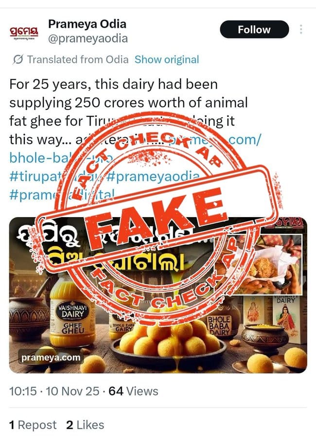 Newsroom, November 13, 2025: Andhra Pradesh's Fact Check Wing of the government issued a stern advisory on social media, countering viral posts alleging Bhole Baba Dairy supplied ghee to Tirumala Tirupati Devasthanams for 25 years, clarifying the firm began deliveries only in 2019.