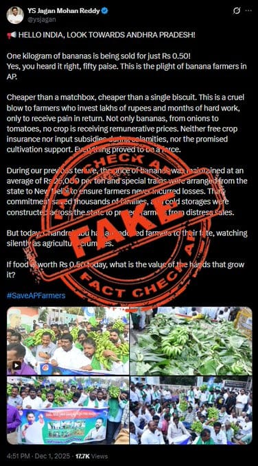 The assertion by former Chief Minister Y.S. Jagan Mohan Reddy on his X (Twitter) account that one kilogram of bananas is being sold for merely ₹0.50 is entirely baseless and far from the truth. As soon as the season began in October, bananas fetched prices ranging from ₹12,000 to ₹14,000 per tonne.