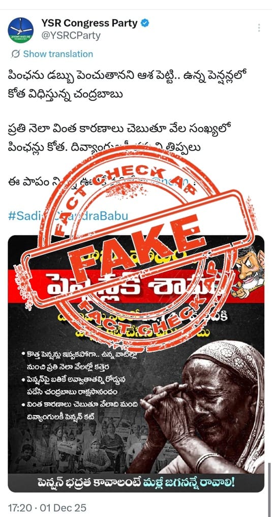 The Andhra Pradesh government strongly condemns a political party for disseminating false information through its social media handles about the distribution of social security pensions. It is unacceptable to falsely accuse the administration of imposing cuts on existing pensions and pin the blame on Honourable Chief Minister Sri Nara Chandrababu Naidu. Claims that thousands of pensions are being slashed each month under flimsy pretexts hold no truth whatsoever.